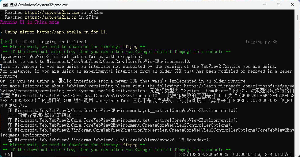 原因:因为FFmpeg是从www.gyan.dev位于国外的服务器上下载,加上www.gyan.dev到国内的网络连接不稳定、经常中断,导致下载失败,因此你才会在ETS2LA的控制台中看到报错信息。